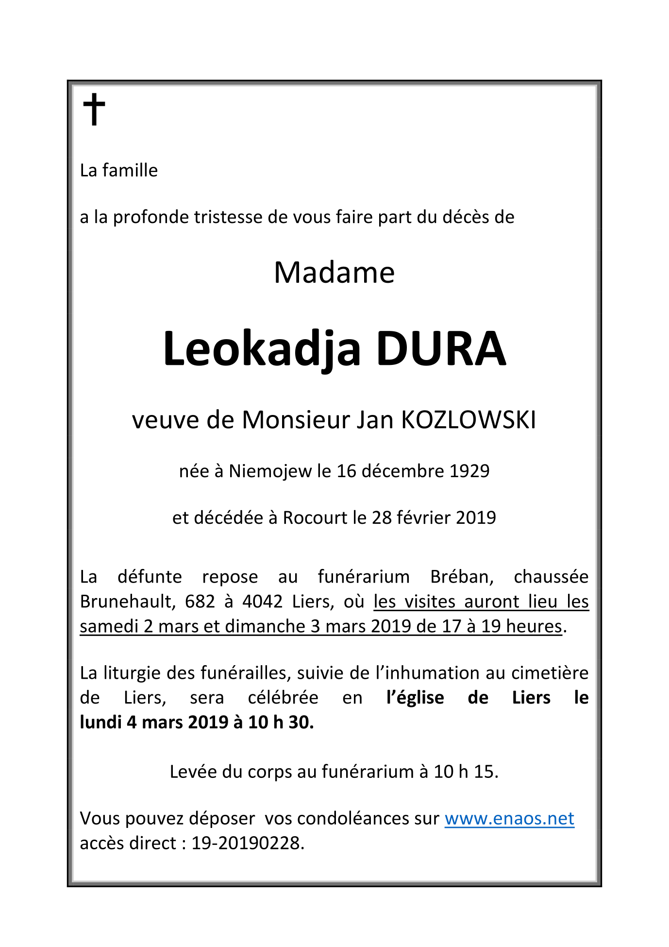 Madame Leokadja DURA veuve de Jan KOZLOWSKI