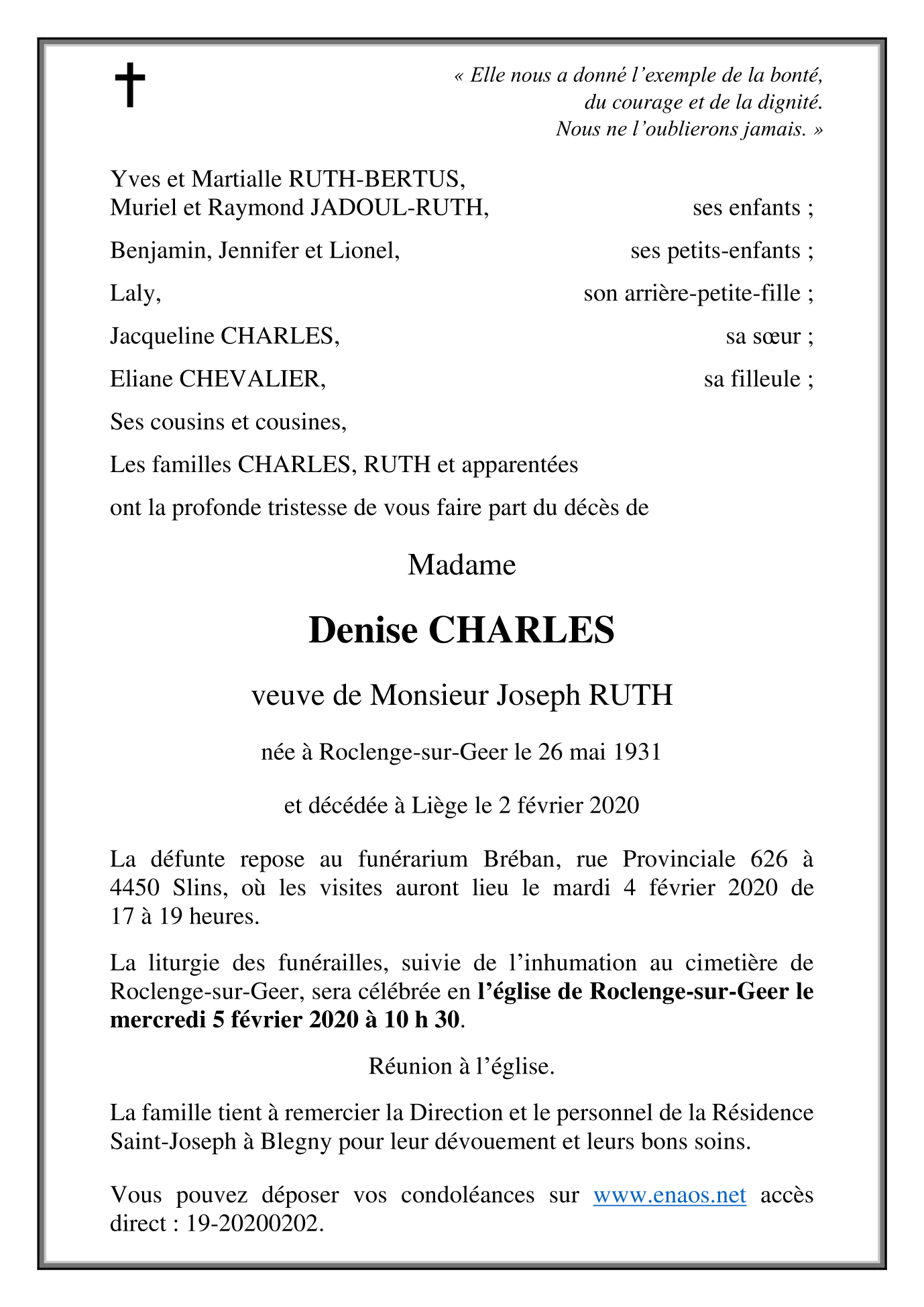 Madame Denise CHARLES veuve de Joseph RUTH