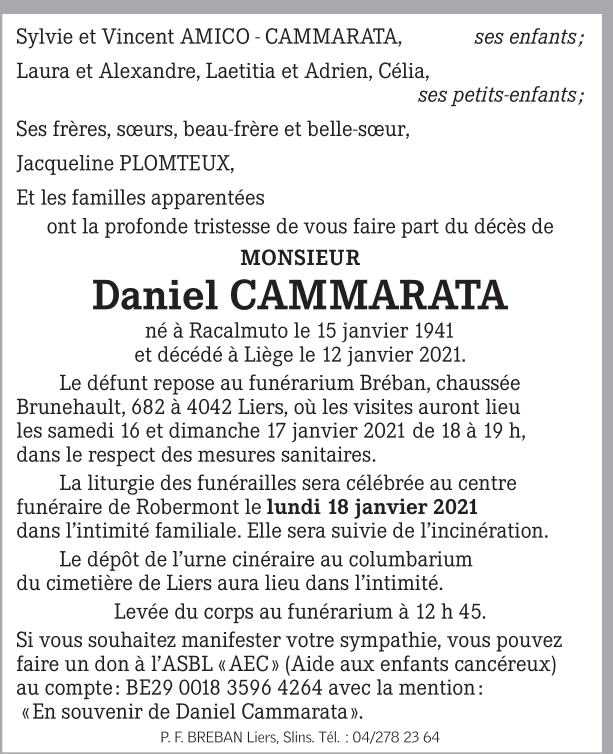 Décédé à Liège (4000) le mardi 12 janvier 2021 à l'âge de 79 ans