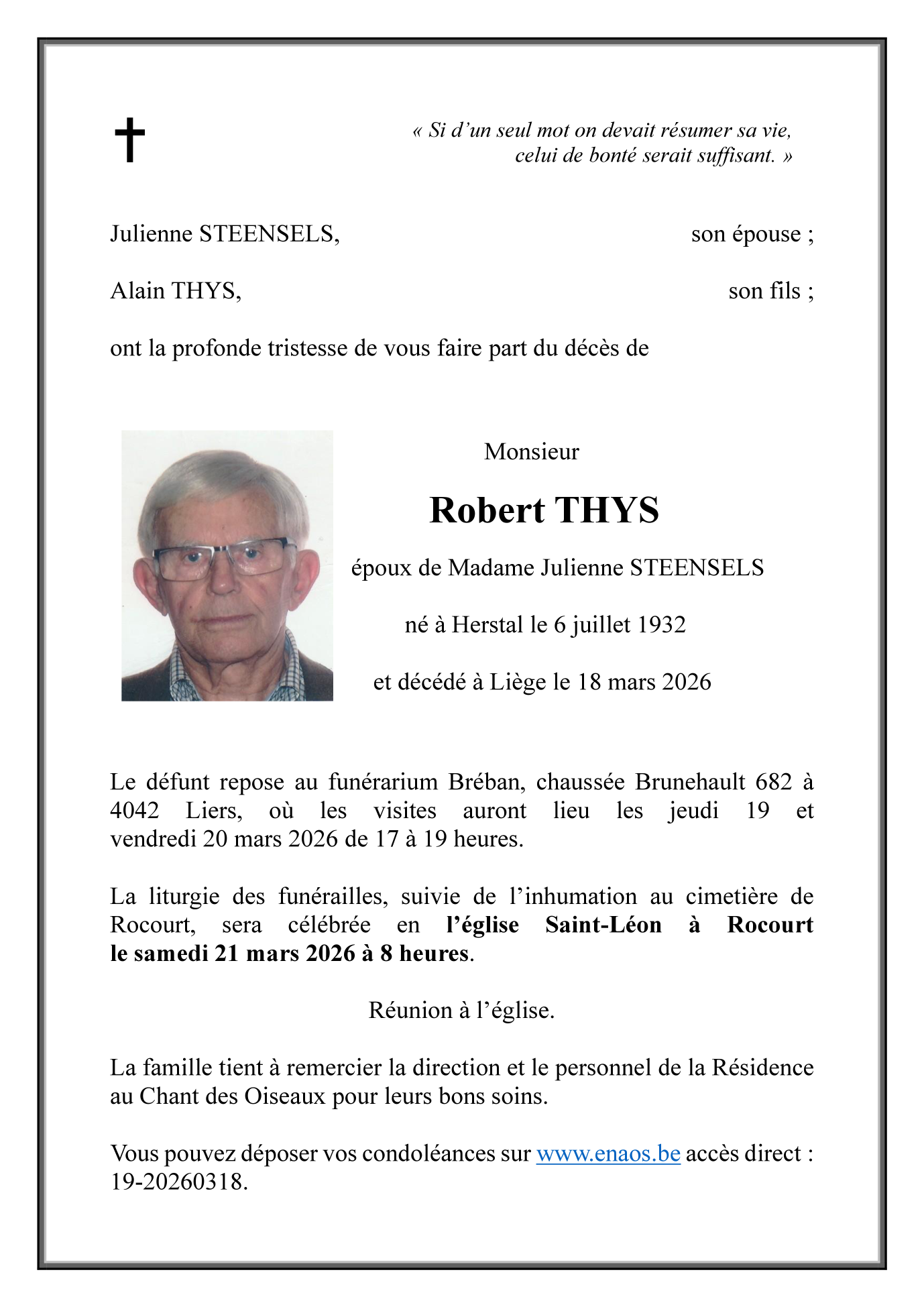 Décédé à Liège (4000) le mercredi 18 mars 2026 à l'âge de 93 ans