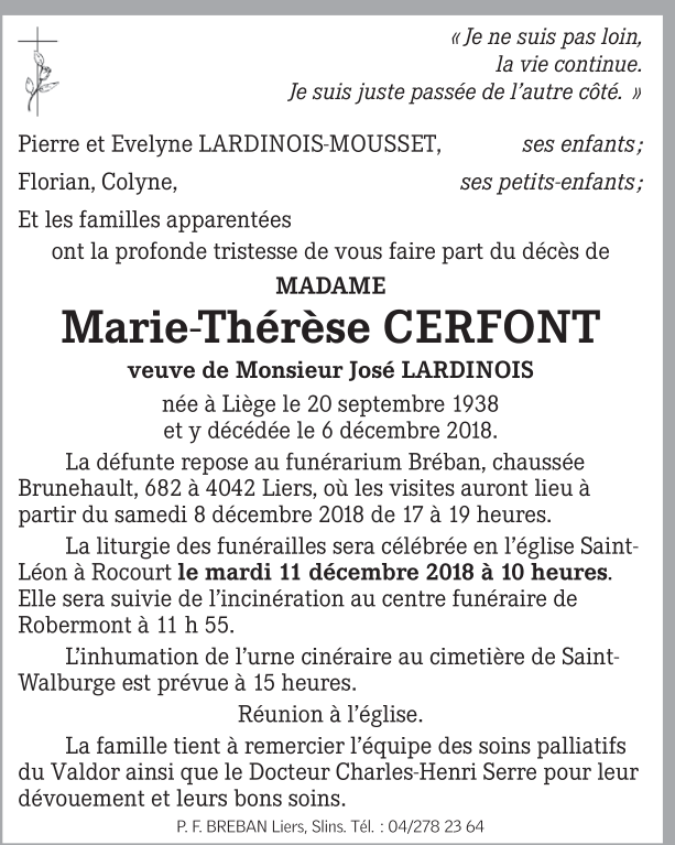 Madame Marie-Thérèse CERFONT veuve de José LARDINOIS