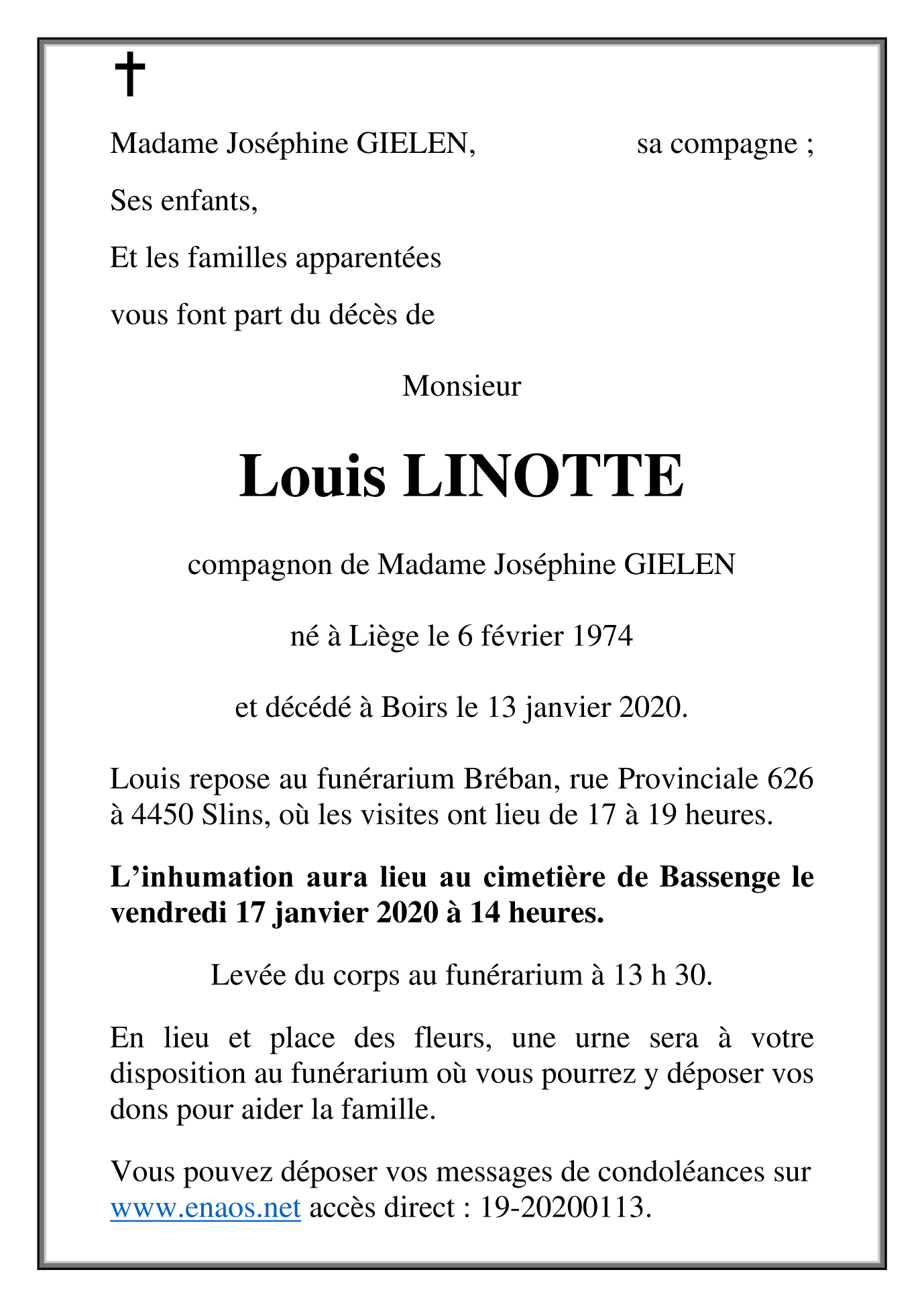 Décédé à Boirs (4690) le lundi 13 janvier 2020 à l'âge de 45 ans
