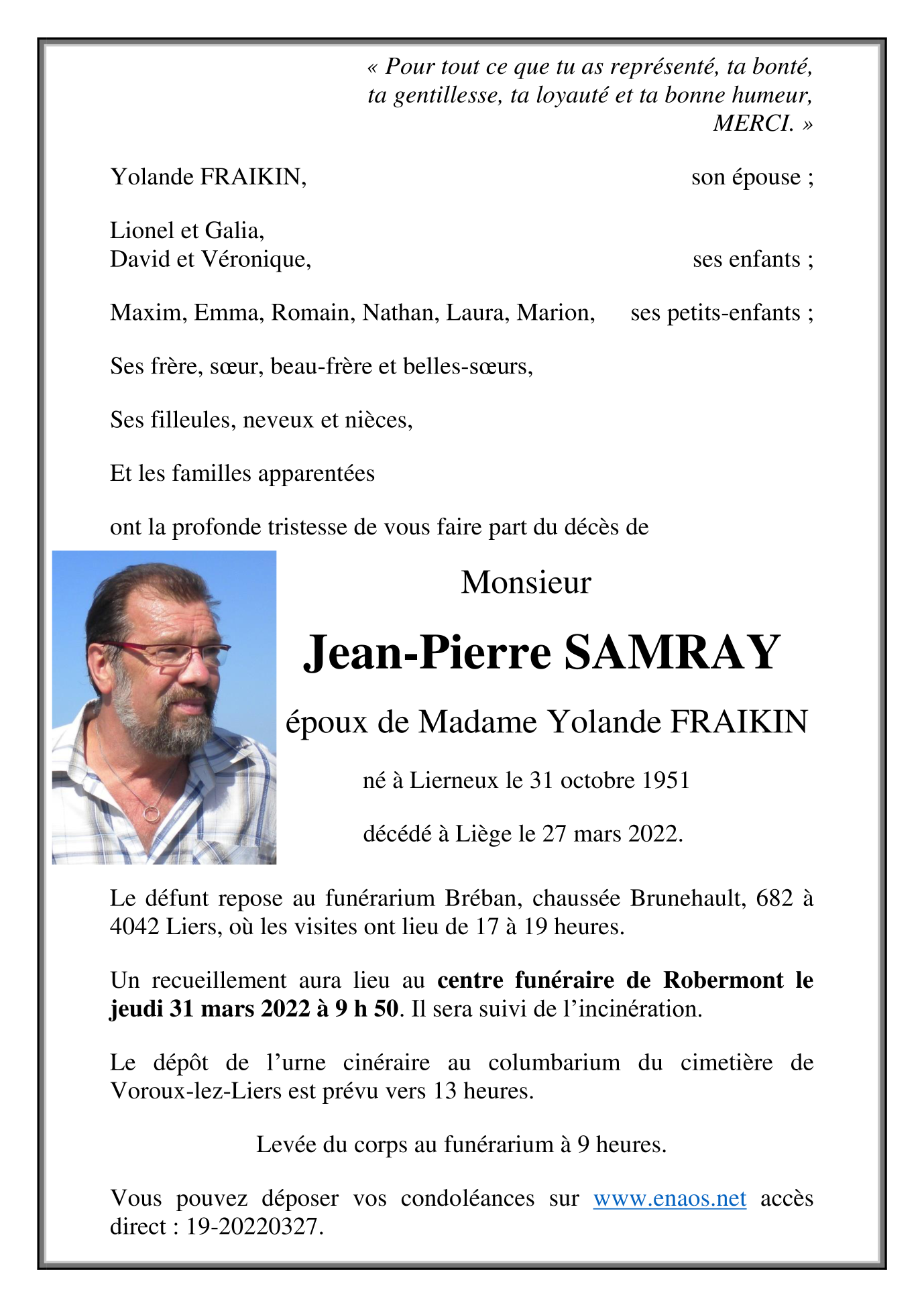 Monsieur Jean-Pierre SAMRAY époux de Yolande FRAIKIN