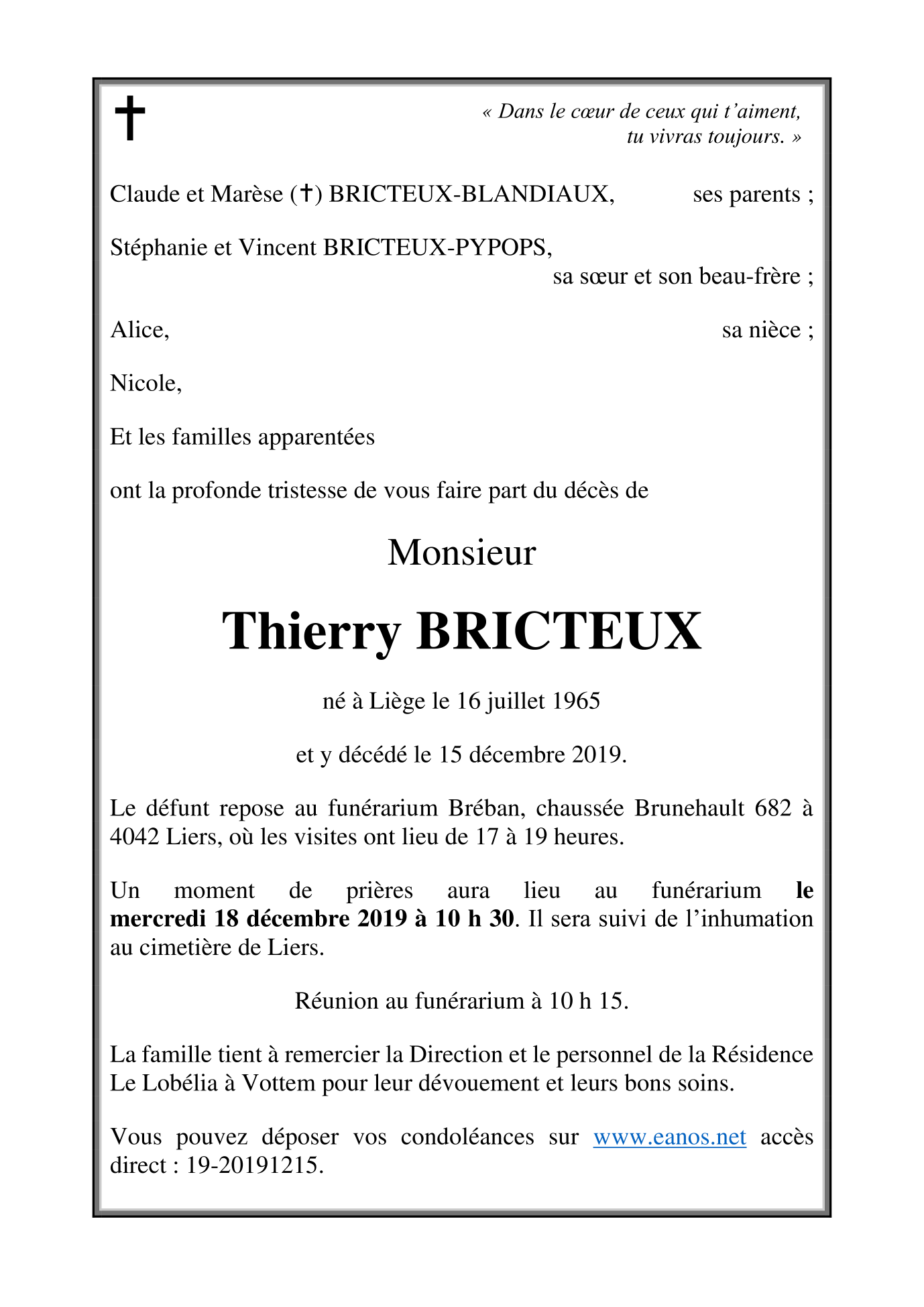 Décédé à Liège (4000) le dimanche 15 décembre 2019 à l'âge de 54 ans