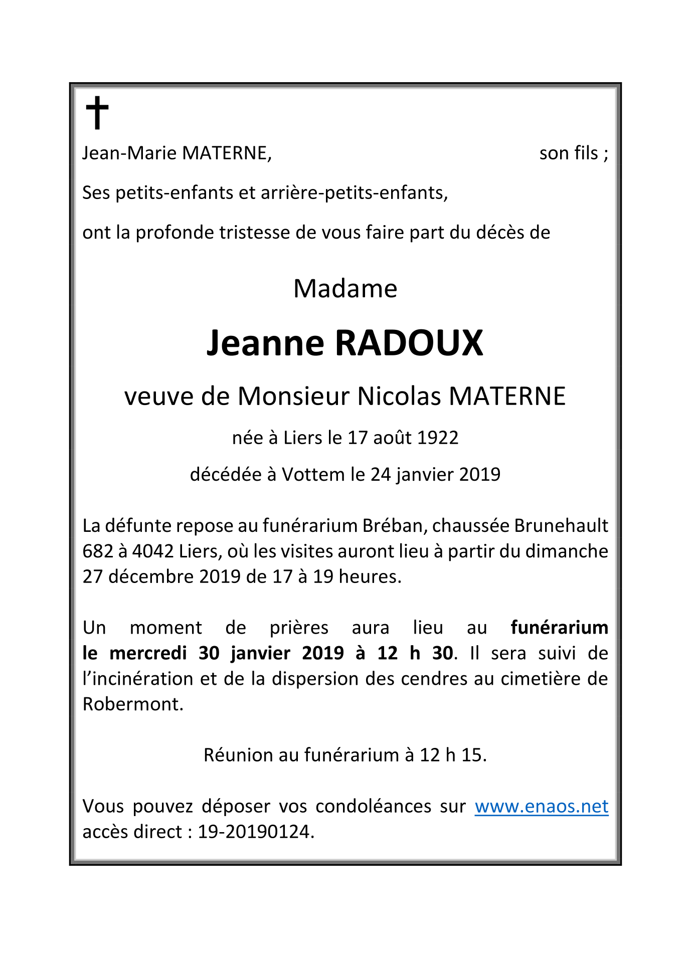 Madame Jeanne RADOUX veuve de Nicolas MATERNE