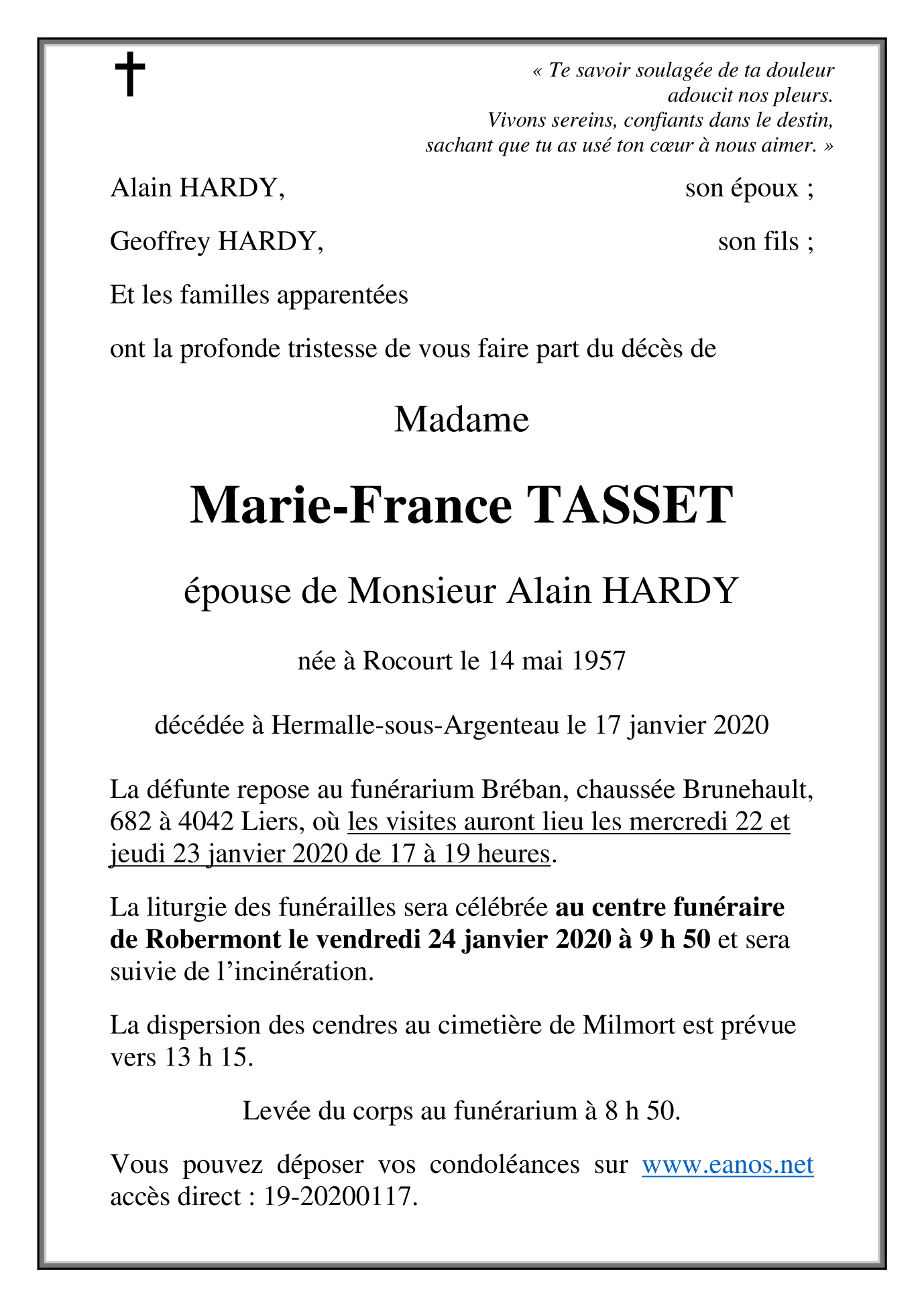 Madame Marie France TASSET épouse de Alain HARDY
