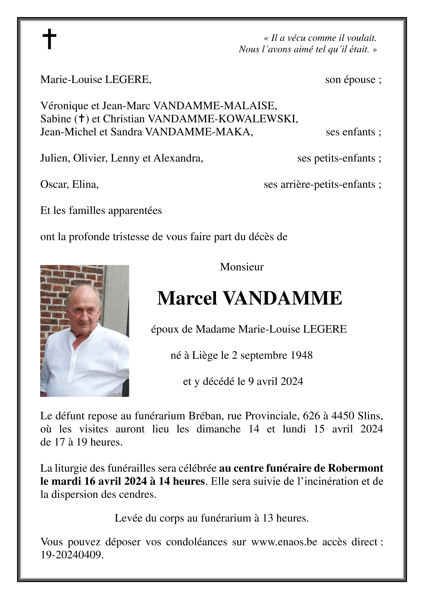 Décédé à Liège (4000) le mardi 9 avril 2024 à l'âge de 75 ans